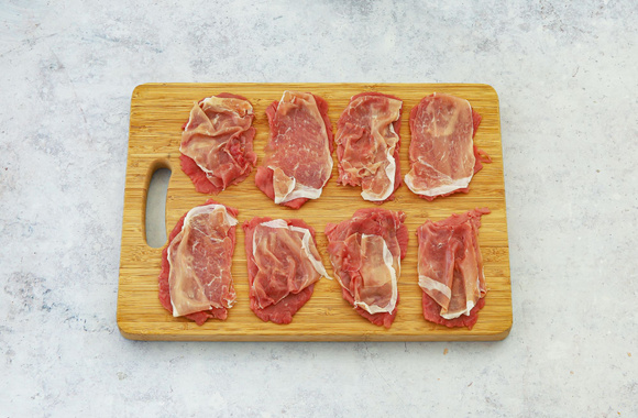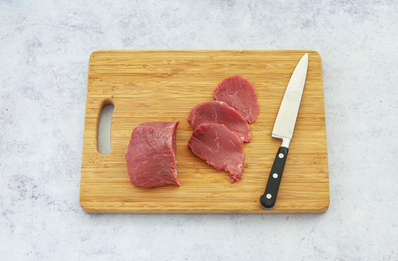 1A l'aide d'un couteau à viande bien aiguisé, coupez la noix de veau en tranches très fines.