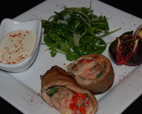 Saltimbocca de brebis, roquette et poivrons, sauce brebis accompagnée de figues caramélisée.