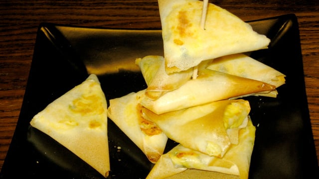 Petits triangles craquants garnis de feta et d'herbes du jardin.