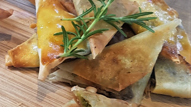 Rabattre le coin bas-gauche de la feuille, en diagonale haut-droit. Faire de même avec le coin bas-droit. Et ainsi de suite. Faire cuire soit à la poêle avec de l'huile. Chaque face doit être bien dorée.
