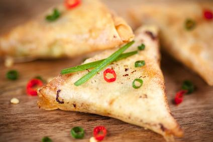 A l'aide des feuilles de brick, former les samoussas. Pour qu'ils soient bien croustillants, les badigeonner d'un peu d'huile, à l'aide d'un pinceau.