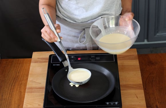 4Faites chauffer la crêpière, graissez-la avec un coton imbibé d'huile. Versez une louche de pâte.