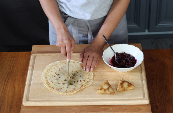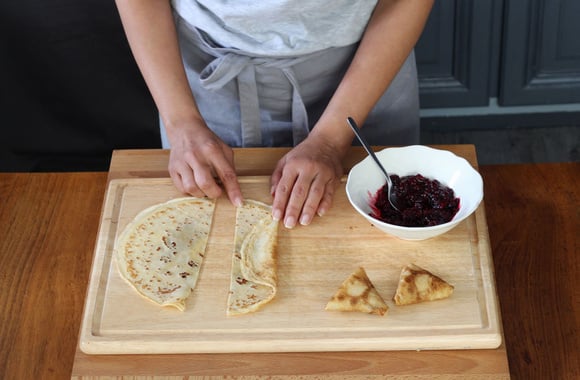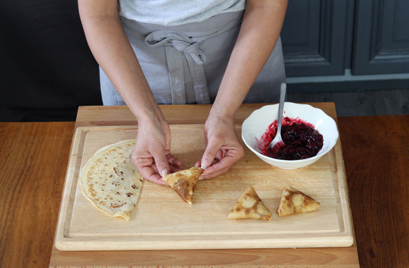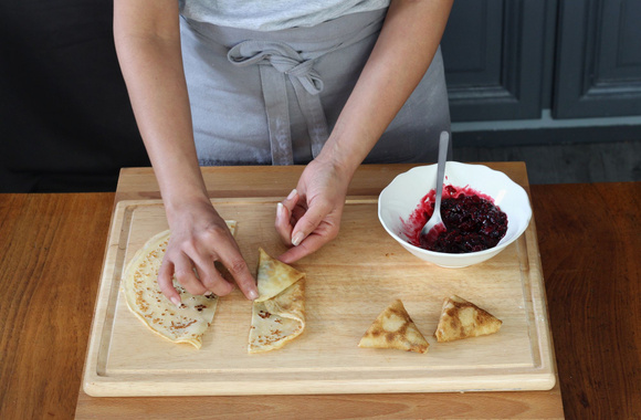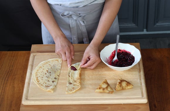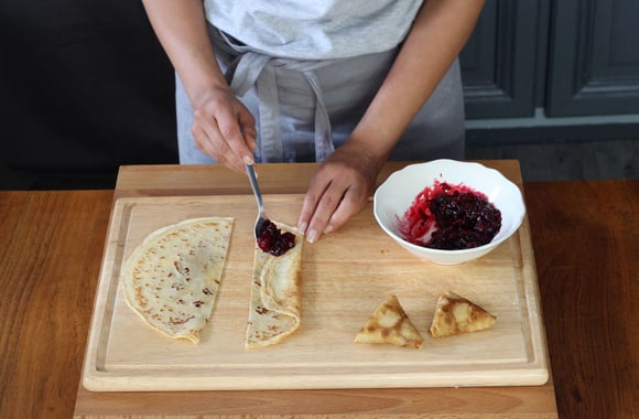 9Ajoutez 1/2 cuillère à café de compotée de fruits rouge sur l'une des extrémités de la crêpe.