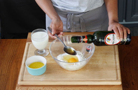 2Mélangez la farine, le sucre et le sel dans un grand saladier. Faites un trou au centre et déposez-y les oeufs et le rhum.