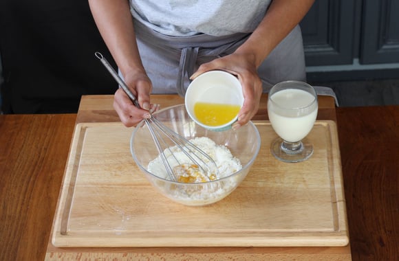 3Remuez doucement en mélangeant petit à petit. Versez le beurre fondu refroidi, tout en continuant à mélanger. Puis versez le lait au fur et à mesure afin éviter la formation de grumeaux en mélangeant cette fois énergiquement.