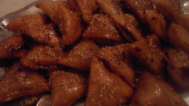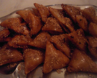 Friture : faire chauffer l'huile, plonger les samsa dans la friture chaude. Dès que les gâteaux ont pris une belle couleur dorée les égoutter, les passer dans du miel légèrement chauffé dans lequel vous diluez une cuillerée à soupe d'eau de fleur d'oranger. Parsemer de pistaches.