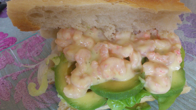 Ouvrir le morceau de baguette, mettre de la salade, les crevettes-mayonnaise, l'avocat, et croquer ! Avec une petite bière c'est d'enfer.