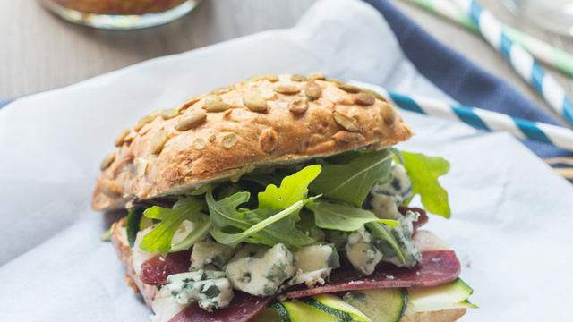 Un sandwich complet avec un pain aux graines de courges, du magret, des courgettes et du Roquefort Papillon. Le tout est relevé par une sauce miel & moutarde.