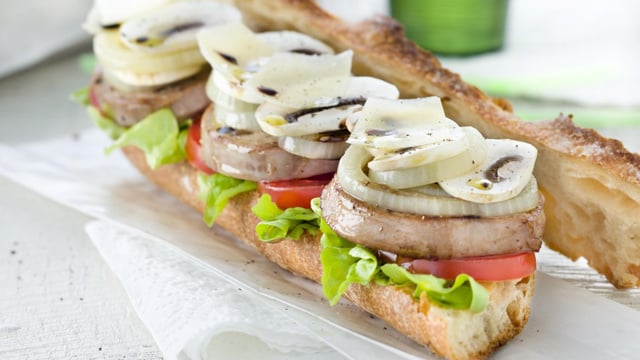 des feuilles de salade, des rondelles de tomate, des morceaux d'agneau, des oignons et des lamelles de champignon. Verser un filet d'huile d'olive et quelques gouttes de vinaigre balsamique, ajouter quelques copeaux de parmesan et refermer le sandwich.