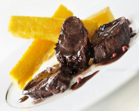 Dresser sur chaque assiette un filet de sanglier, 3 ou 4 frites de polenta et décorer d'un trait de sauce au vin et aux myrtilles sauvages.