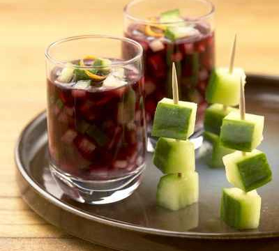 Egoutter le vin, rectifier l'assaisonnement en sucre et ajouter 150gr de de concombre en dés réguliers.