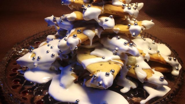 De délicieux sablés en forme d'étoiles, qui superposées les uns sur les autres forment un sapin le tout parsemé de fromage frais, beau et bon!