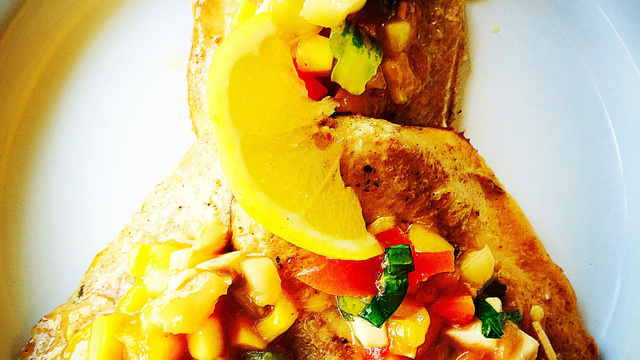 Sardines grillées, salades légumes du soleil basilic et pêche blanche