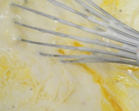 - 2- Porter à ébulition en fouettant constamment et cuire une minute à ébulition.- Retirer du feu et laisser refroidir un peu.- Ajouter le fromage râpé et le jaune d'oeuf.- Utiliser ou conserver au froid.
