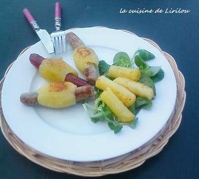 Glisser les moitiés de saucisses et de merguez dans les pommes de terre et les faire revenir avec les trognons dans la poêle le temps de les faire dorer sur toutes les faces.