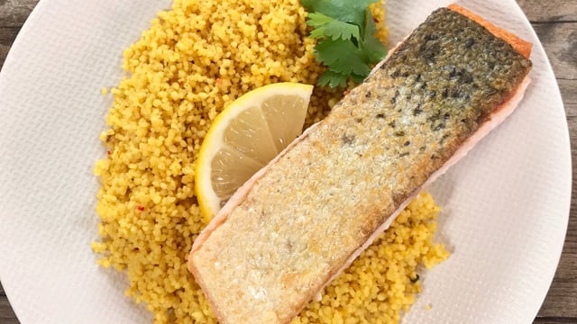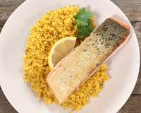 Quand le poisson est mi cuit, servez avec la semoule et des tranches de citron.