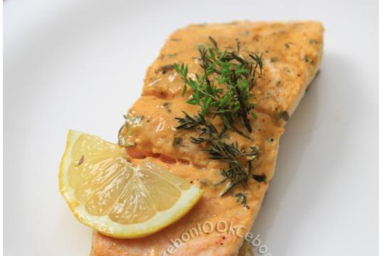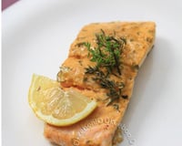 Sur une feuille de papier à papillote, disposer chaque pavé de saumon (côté peau vers le bas), badigeonner la moutarde avec le dos de la cuillère sur le saumon, saler, poivrer et parsemer de thym frais. Refermer la papillote et enfourner pour 10 min.