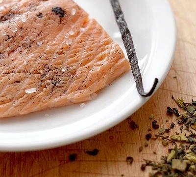 Pendant ce temps, préparer votre fumoir. Dans le fond de votre wok (ou votre casserole), déposer un peu de papier aluminium. Ajouter le thé et la gousse de vanille grattée. Recouvrir du panier-vapeur retourné. Le saumon ne doit pas toucher le thé. Déposer le saumon sur le panier vapeur, mettre le couvercle et faire chauffer le wok. Lorsque cela commence à fumer, compter environ 15 minutes (20 si le filet est épais).