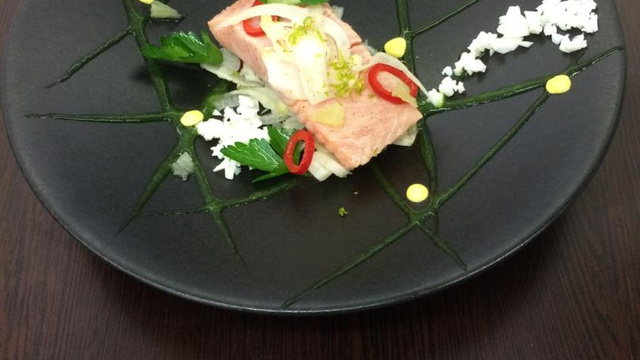 Réalisez une salade crue avec fenouil, citron et piment, vinaigrette jus de citron et huile de cuisson du saumon.