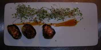 Dans une assiette, dresser des germes (au choix) assaisonnés de sauce soja et huile d'olive et trois tronçons de croustillant retournés dans Assiette dans le sens de la hauteur.