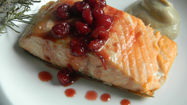 Déposer un pavé de saumon sur l'assiette avec un peu de purée de marrons chaude et la réduction de cranberries sur le poisson.