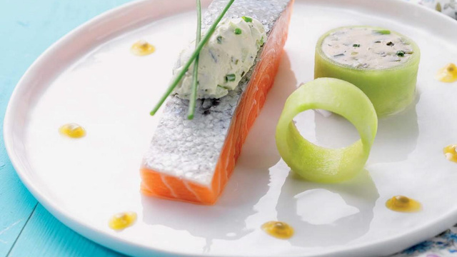 Dresser sur des assiettes individuelles en déposant un morceau de saumon accompagné de deux ou trois anneaux de concombre avec la farce crémeuse.