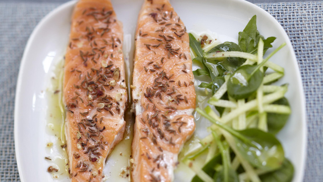 Coupez chaque pavé de saumon en 2 ou 3 tranches. Assaisonnez-les puis parsemez-les de graines de carvi sur une face. Chauffez une poêle avec 2 cuillerées à soupe d'huile d'olive. Déposez les morceaux de saumon, laissez-les cuire 6 à 8 min sur feu doux sans les retourner.