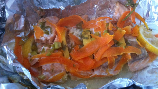 Ajouter du sel, du poivre et une cuillère de crème le long du saumon.Refermer le papier aluminium sans écraser le contenu.