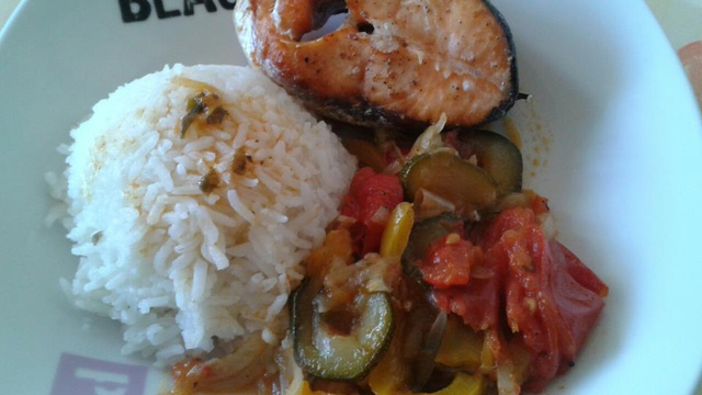 Saumon mariné au citron vert et aromates servi avec un riz thai et légumes provençaux. Réalisable aussi avec du thon frais.