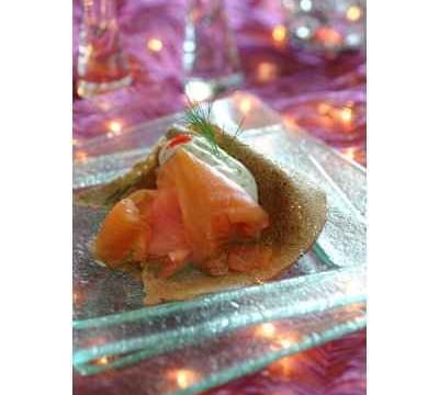- Placer dans un mixeur la farine de sarrasin, les oeufs, l'eau, l'huile d'arachide, le sel, la vodka et le piment doux puis mixer une minute. Le mélange doit être lisse et sans grumeau.Dans une poêle à crêpes, verser une petite louche d'appareil à galettes puis laisser cuire quelques instants sur chaque coté. Recommencer l'opération jusqu'à ce qu'il n'y ait plus de pâte. Réserver les galettes sur une assiette recouverte d'un film alimentaire.Laver l'aneth, en prélever deux brins pour la décoration, puis hacher finement le reste.Monter la crème liquide en chantilly à l'aide d'un fouet électrique, puis ajouter l'aneth ciselé ainsi que le jus de citron. Saler et poivrer.Placer sur une assiette une galette de sarrasin pliée en deux puis roulée en pyramide, poser sur la crêpe une tranche de saumon fumé légèrement chiffonnée. Placer une cuillère à soupe de crème fouettée sur le dessus, puis finir par une petite cuillère à café d'oeufs de lumps et une peluche d'aneth. Recommencer l'opération sur chaque assiette, puis servir sans attendre.