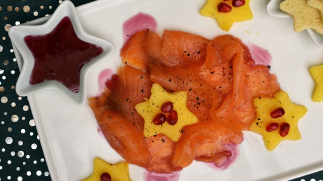 Disposez les tranches de saumon fumé sur les assiettes, ajoutez les étoiles de mangue et quelques grains de grenade ainsi que quelques gouttes de sirop... poivrez et servez bien frais avec du pain grillé :-)