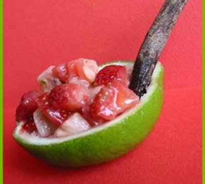 - La veillePlacer le pavé de saumon dans un petit récipient et le recouvrir de gros sel et de sucre. Laisser reposer une nuit au réfrigérateur.Le lendemainRincer abondamment le pavé de saumon à l'eau. Le détailler en dés et le poivrer. Ajouter la poudre de réglisse et le zeste d'un citron vert. Couper les deux autres citrons verts dans la hauteur et les évider. Presser la pulpe pour en extraire le jus. Réserver les coques. Nettoyer les fraises et les couper en dés de la même taille que le saumon. Dans un saladier, mélanger les dés de saumon, les fraises et le jus des citrons verts. Faire mariner à nouveau au frais plusieurs heures pour que les saveurs diffusent.Evider les deux derniers citrons verts. Gratter les huit coques pour retirer la peau puis les garnir de la préparation. Planter un morceau de bâtons de réglisse pour décorer et servir très frais.Pour une entrée, servir dans des verrines.
