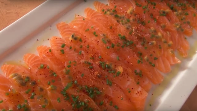Fines tranches de saumon au sel acidulées de fruits de la passion. Une note exotique et tonifiante pour mettre en appétit.
