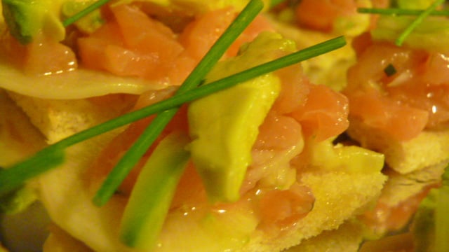 Saumon mariné, avocat, concombre et délice.