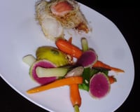 Faire cuire 200 g de lentillons rosés pendant 30 min. Ne pas saler et porter à ébullition. Laver les 600 g de poireaux, les couper en petits tronçons. Les mettre à suer dans une casserole légèrement beurrée avec sel et poivre sur feu doux, environ 10 min. La casserole doit rester bien fermée avec du film alimentaire. Écraser les lentillons rosés au mixer, puis les passer au chinois de façon ne garder que la pulpe. Crémer légèrement;, saler et poivrer (on peut rendre la préparation moins épaisse en rajoutant de la crème). Tronçonner le filet de saumon (900 g) en 6 morceaux. Poêler 4 min de chaque coté, saler et poivrer. Sur une assiette chaude, disposer une part de poireaux au centre, verser autour la crème de lentillons rosés. Poser les filets de saumon sur les poireaux. Décorer avec des brins de ciboulette.