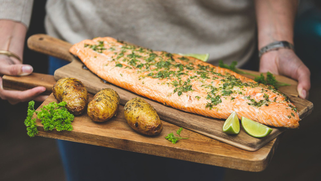 Le saumon est ici cuit au barbecue sur une planche de cèdre afin de lui apporter un petit goût fumé et de ne pas trop agresser la chair grâce à une cuisson en chaleur indirecte.