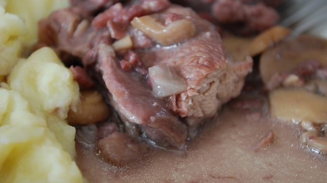 Faire revenir les morceaux de dinde dans un peu de beurre et de farine. Ajouter 20 cl de Bourgogne rouge et mélanger.