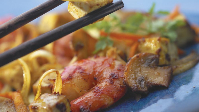Faire revenir à feu doux environ 15 mn dans une poêle légèrement huilée les différents légumes, le tofu coupé en morceaux, les crevettes, la sauce de soja, le curry et l'ail haché. - 2