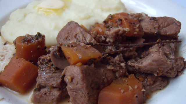 Peler et couper en morceaux les carottes. Chauffer 3 c à s d'huile d'olive dans une cocotte et y faire dorer les morceaux de viande pendant 5 min avec le thym et l'ail haché.