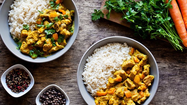 Coupez la viande en morceaux et ajoutez-la dans la cuve avec les carottes. Ajoutez également la moutarde, la crème, le thym, une pointe de curcuma, le sel et le poivre.