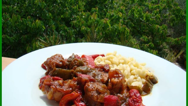 Recette classique de morceaux d'échine de porc, cuisiné avec poivrons verts et rouges