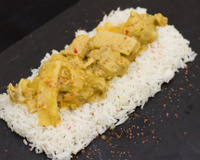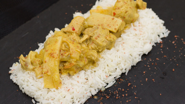 Dans un faitout en inox, faire colorer la viande marinée sur toutes ses faces. Ajouter l'ananas, les pousses de bambou égouttées et le lait de coco. Baisser le feu et laisser mijoter pendant 30 minutes. Saler et poivrer. Servir avec du riz basmati.