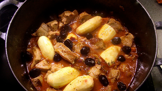 Vous pouvez aussi choisir de le cuire au four comme j'ai fait ce coup ci dans ma vieille cocotte Godin en fonte..... Là comptez 1h30 env. à 170°C et rajoutez du Porto et un peu d'eau si besoin, car il y a un peu plus de déperdition de liquide.