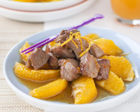 Disposer les segments d'oranges en rosace, déposer les dés d'agneau au centre et les napper de caramel à l'orange.