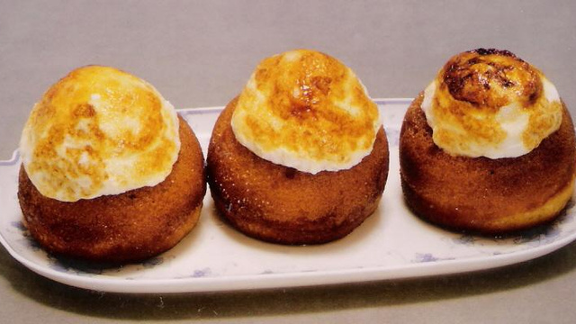 Garnir le milieu des savarins d'un dôme de crème - répandre sur le dessus du sucre en poudre - bruler au fer ou au chalumeau .