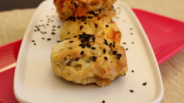 Préchauffer le four à 200 deg. Former des petits boules de 4 cm de diamètre environ et applatisser-les legèrement sur la plaque de cuisson. Badigeonner d'un mélange oeuf-eau et parsemer de graines de sésame noires. Enfourner 12 min et déguster tiède ou froid.