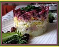 Mon commentaire: Salade typiquement russe. Même si vous n'aimez pas de hareng vous pouvez aimez cette salade. (J'utilise hareng russe. Il est beaucoup plus gros et moins salé. Vous pouver utiliser aussi saumon fumé)