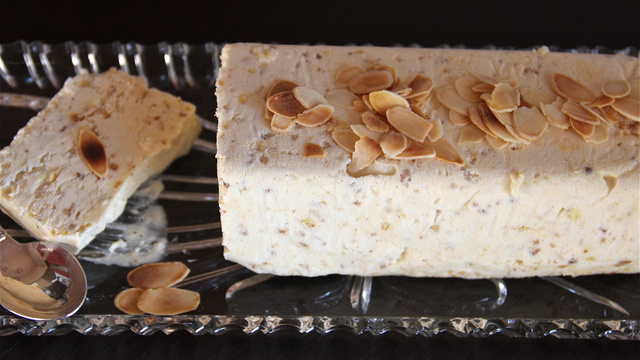 Au moment de servir, démouler le semifreddo sur un plat rectangulaire, parsemer d'amandes effilées grillées, et servir. Le semifreddo se sert lorsqu'il commence à ramollir.