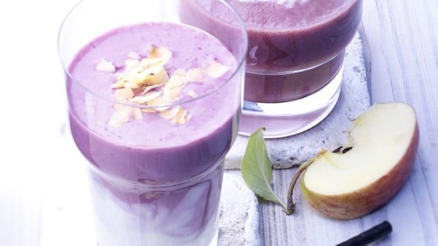 Répartissez le reste du lait de noix de coco sur 4 verres et versez-y délicatement le smoothie. Mélangez doucement avec une fourchette de façon à former un dessin de marbrures bleues et blanches. Décorez selon votre goût avec des copeaux de noix de coco et servez immédiatement.