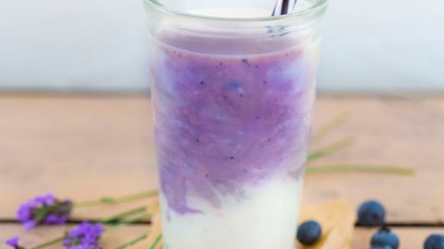 Ajouter 2 glaçons dans chaque verre, puis verser délicatement le smoothie aux myrtilles sur celui à la banane et à la vanille de façon à obtenir un joli résultat bicolore.